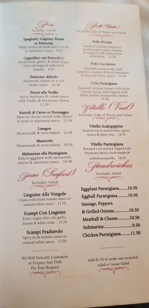 The standout dishes include a mouthwatering chicken parmigiana paired with an excellent wine selection, as well as a classic lasagna infused with spicy Italian sausage—a dish praised by many. The attentive service is consistently highlighted, ensuring your glass is never empty and your experience is seamless.